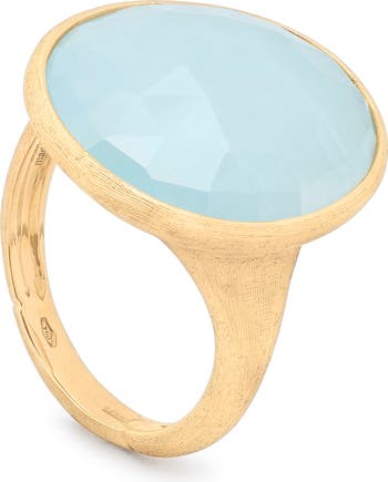 Organic forms inspire an 18-karat-gold cocktail ring featuring fine hand engraving and a faceted aquamarine.