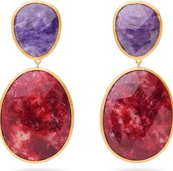 Beautiful charoite and thulite stones lend organic color to these double drop earrings framed in hand-engraved settings of 18-karat gold.