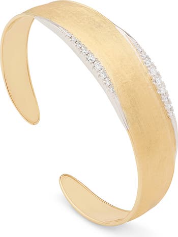 Hand-engraved details using Florentine techniques create rich, light-catching texture on this 18-karat gold cuff bracelet framed with undulate streams of pavé diamonds.