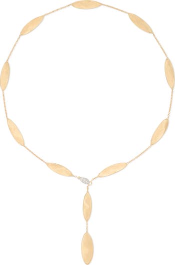 Hand-etched stations mimic the gentle flutter of petals in the wind on this Italian-crafted necklace highlighted with a cluster of pavé diamonds.