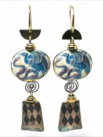 Elevate your accessory collection with these exquisite Misfits & Heroes Earrings, a stunning embodiment of artistry and elegance. Each pair is meticulously crafted from hand-painted ceramic, reflecting a unique synthesis of traditional craftsmanship and contemporary design. The vibrant round ceramic disc, adorned with intricate bird motifs and an enchanting serpent, offers a bold statement piece that seamlessly transitions from day to night. With an elegant semi-circular gold metallic accent and an oxidized spiral wire connecting to a beautifully detailed pendant, these earrings are not just jewelry; they are a conversation starter that captures attention and admiration. Perfectly designed for adults of all styles, these earrings are a luxurious addition to any outfit, inspiring creativity and a sense of individuality. Whether you're dressing up for an evening out or adding flair to your everyday look, the Misfits & Heroes Earrings are guaranteed to make a striking impression.