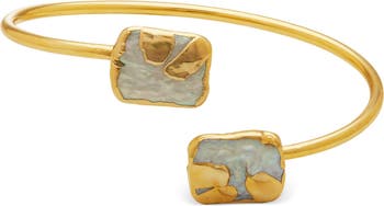 The Lune Bracelet is a handcrafted open-ended bracelet made from 22k gold-plated brass, featuring two square baroque shell pearls dipped in gold. The adjustable band ensures a comfortable fit, allowing the bracelet to sit perfectly on the wrist.