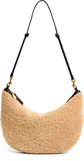A slouchy design and half-moon profile bring fluidity to a spacious shoulder bag crafted from fluffy shearling.