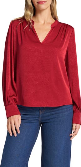 A subtle abstract jacquard lends dimension to this satin pover top finished with a curved hem that looks great untucked.