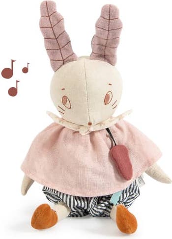 Lune the Rabbit from After the Rain collection, is a stuffed musical toy that displays Japanese nursery tunes. She has a lovely embroidered face, large fleecy ears and is dressed in striped bloomers with a pink linen blouse. She sits nearby the crib, displaying a sweet melody from the music box hidden inside the body part. Your baby will soon feel soothed and be lulled to sleep.