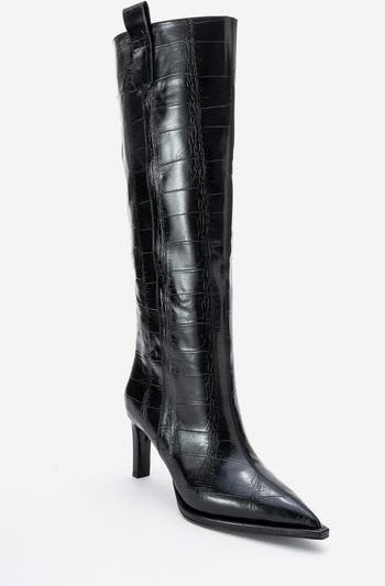A luxurious knee-high boot that blends a glossy crocodile-embossed finish with refined pointed lines and subtle gold accents
