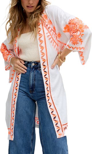 Lupe embroidered is a must have for your next escape, made from mid-weight linen viscose fabric in white with neon orange geometric embroidered motifs. Classic features; voluminous sleeves with an open front.