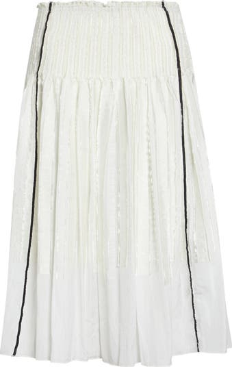 Smocking at the hips constrains the intricate woven jacquard that's released and then ends gradually in a staggered pattern above the hem. The rich, fringed texture of the fil coupé weave is highlighted by three lines of wavy black piping front and back.