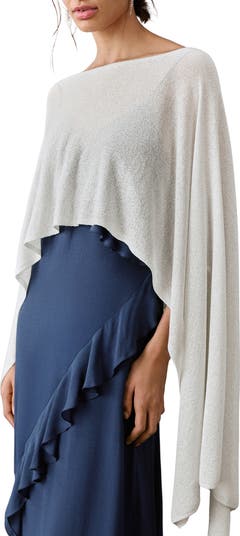 A hi/low silhouette is complemented with a wide neck to bring structure to a superflow cape knit with glittering metallic.
