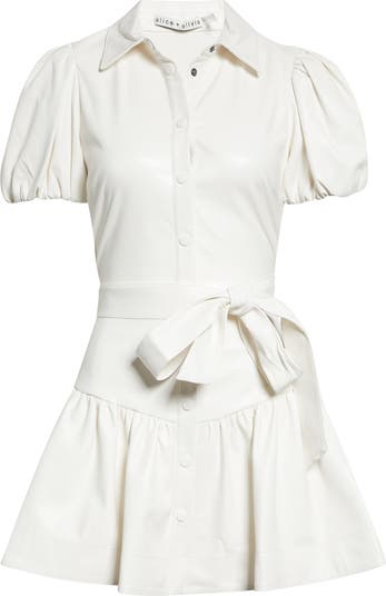 A stem-showing dress cast in smooth faux leather perfectly combines sweet styling with a bit of an edge while puffy sleeves and a tied waist complete your look.