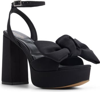 A soaring platform and block heel add a retro-cool aesthetic to a glam sandal decorated with an elegant bow and featuring a dual-density foam footbed.