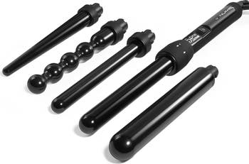 5-in-1 Lustrum curling wand for versatile styling. Infrared technology and tourmaline for healthy, shiny curls. Travel case and glove included.