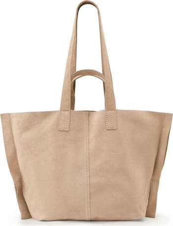 Subtle logo debossing adds a signature flourish and highlights the supple suede exterior of a slouchy tote featuring multiple straps for convenient on-the-go styling.