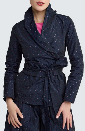 Cut from softly structured jacquard memory taffeta, this wrap-style jacket features an elegant shawl collar, double-breasted closure, and a tie-belt to cinch the waist for definition.