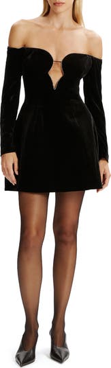 Unmistakable retro romance defines this shoulder-baring minidress complete with sparkling trim that highlights the flirty plunge neckline.