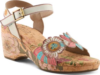 Aged-finish hardware and hand-painted floral motifs add artisanal flair to a cushioned leather sandal set on a cork-wrapped platform and sculptural wedge heel.