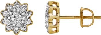 These gorgeous 0.48 carat diamond earrings feature a delicate cluster design meticulously set in 10k yellow gold frame shaped like a flower and a screwback setting. Their elegant arrangement highlights the timeless brilliance of the diamonds.