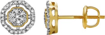 These gorgeous 0.14 carat diamond earrings feature a delicate cluster design meticulously set in 10k yellow gold with a screwback setting. Their elegant arrangement highlights the timeless brilliance of the diamonds.