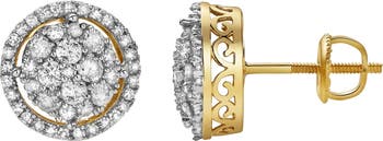 These gorgeous 0.63 carat diamond earrings feature a delicate cluster design meticulously set in 10k yellow gold with a screwback setting. Their elegant arrangement highlights the timeless brilliance of the diamonds.