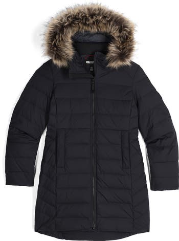 This cozy quilted parka is filled with toasty 700-fill-power down and fitted with a fuzzy removable faux-fur ruff at the hood to deliver a lightweight, full-coverage puffer that's perfect for cold-weather climates. Internal knit cuff gaiters with thumb loops keep hands and arms warm, while brushed tricot lining inside the collar and pockets brings a warm touch.