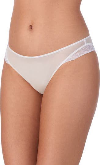 A pinch of shirring at the back and lace sides add to the comfortable fit of these sheer and stretchy low-rise bikini briefs.
