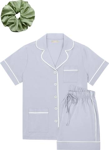 Gift sophisticated slumber with this dreamy duo. The softest fabrics, Luxe Stretch Cotton and Satin come together for a bundle that's wishlist worthy. Gift set contains Luxe Stretch Cotton Pajama Set and Soft Satin Scrunchie.