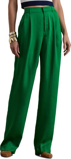 Opt for a sophisticated look in these straight-leg pants fashioned from satiny-soft fabric with sharp pleats to emphasize the drape.