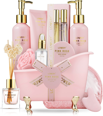Rose bath basket - this spa day bath gift set for women includes 150ml shower gel, 150ml bubble bath, 100ml body lotion, 50ml body scrub, 30ml massage oil, 8pc essential oil diffuser set, 85g handmade rose soap, 2x 10ml eau da parfum perfume, 100% pink quartz gua sha massage tool, cosmetic bag and tub. Luxurious spa gift for women - our bath sets for women gift selections make the perfect birthday, valentine's day, mother's day, or holiday gift for any woman.
