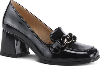 A square apron toe and chain bit bring loafer-inspired shape to this glossy leather pump that's smart and stylish.