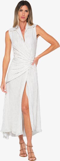 The Lydia Dress 2.0 features a sleeveless collared neckline with a wrap-style bodice and soft gathering at the waist. Crafted in airy linen gauze and lined with smooth viscose, it falls to a fluid midi length with a front slit for ease and movement.