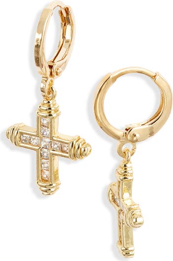 Delicate 24-karat gold-fill crosses embedded with sparkling cubic zirconia dangle from 18-karat gold-overlay huggie hoop earrings for a timeless emblem with a touch of radiance.