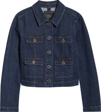 Bezeled buttons shine on this dark-wash denim jacket that's kissed with stretch for added ease.