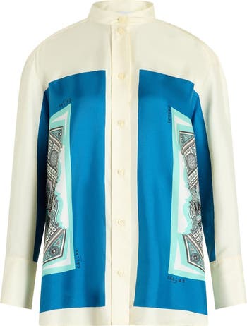 The Lyn shirt is an oversized, button front, long sleeve shirt made from a signature scarf print in a silk glossy twill.