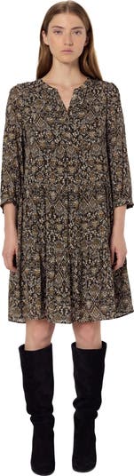 Bohemian chic spirit for the Lyne dress adorned with a cultural print. It is crafted from a fluid material with feminine draped ruffles.