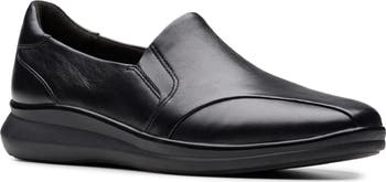 A subtle square toe and streamlined profile bring a classic look to this leather wedge flat grounded by a cushioned footbed for all-day comfort.