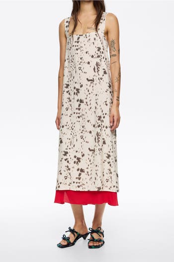 Midi dress with straight cut and double-layer hem with contrast fabric and side slits