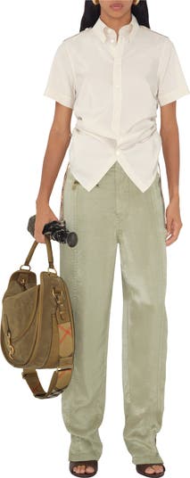Trousers made in Italy from garment-dyed lyocell, unlined for a lighter feel and tailored to a relaxed fit with a dropped rise. The design features B buckle sliders at the waist to adjust the silhouette and a metallic embroidered B crest. The style debuted on the Burberry Summer 2025 runway.||Press-stud and zip closure|Front zip pocket, side zip pockets, back zip pocket|Adjustable waist tabs|Zip cuffs