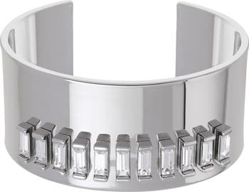Baguette crystals bring dimensional shine to this sleek cuff bracelet polished to a mirror finish.