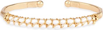Lustrous seeds of mother-of-pearl are artfully wrapped in slender wires, blurring the line between art and fashion with this high-shine cuff bracelet.