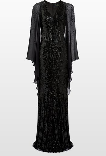 Designed for dramatic elegance with a fluid, light-catching finish this gown will dazzle any room. The fitted silhouette features a V neckline and is complemented by a sheer overlay that drapes into soft, flowing sleeves, adding a sense of movement and grace. Sequins arranged in vertical lines enhance the gowns elongating effect, creating a look that feels both sophisticated and striking ideal for evenings that call for effortless impact.