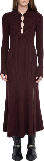 Mostly made from merino wool for lightweight warmth, this ribbed sweater dress features bejeweled buttons and a gracefully draped silhouette.