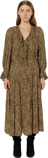 Crafted from a smooth and fluid fabric, the Lyza dress stands out with it's leopard print, pleats, and ruffles. It features buttons along its entire length and an elasticated waist.