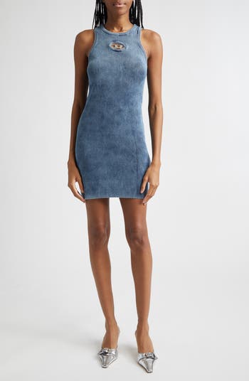 Powered by Y2K nostalgia, DIESEL's superhero-esque Oval D logo reveals a sultry flash of skin beneath a polished metal cutout on this finely ribbed body-con minidress with a timeworn patina reminiscent of faded blue denim.