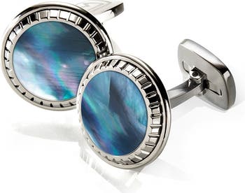 Fine shell inlays add natural color to sharp cuff links crafted from lustrous steel.