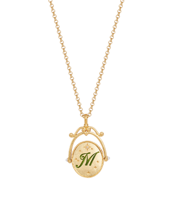 Our vintage style gold spinner initial necklace makes a wonderful gift or treat yourself as an act of self-love. Set in 22ct worn gold brass, on one side you'll find your 'M' initial engraved in a beautiful scroll font, on the other side, a hand-painted magnolia flower. Representing new beginnings and optimism it will take centre stage in any jewellery collection.