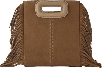Maje’s iconic M bag in suede leather is available in this season’s colours. Fringing, sheathed handle, topstitching, embossed gold logo, engraved signature on the snap hooks, magnetic tab closure. Cotton lining. Removable and adjustable 81 cm shoulder strap. Wear over the shoulder, carry by hand or wear cross-body with the adjustable and removable leather shoulder strap.