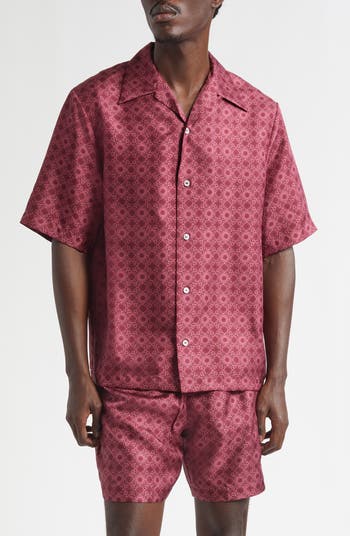 A hypnotic field of Mike Amiri’s monogram animates this silk button-up while a convertible collar flips from relaxed camp to crisp point to capture the retro-cool energy of his fall '25 collection.