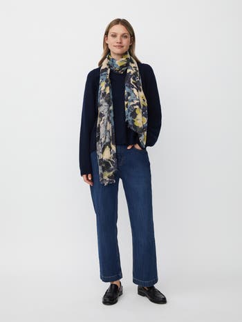 Let the beautiful floral print on this scarf elevate your style. Featuring a soft blend of wool and cotton, this scarf is comfortable to wear and has short fringes at the ends.