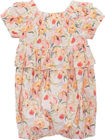 This wrinkle-free soft-hand woven romper features a vibrant floral pattern, complemented by short puffed sleeves and a square elastic neckline. Fabric Care & Content Machine Wash Cold | Line Dry | Do Not Bleach 100% Polyester