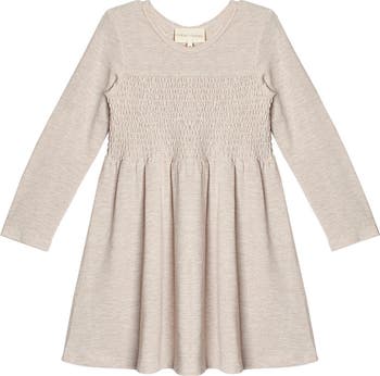 Soft, cozy long-sleeve dress in a neutral brown with a smocked bodice and gathered skirt for a classic, playful silhouette. Features a crewneck and shirttail hem for comfortable movement. 94% polyester, 6% spandex. Machine wash cold, line dry, do not bleach.